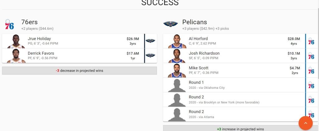 This is the one of two trades that I could see Al Horford and J-Rich moved in. Getting Jrue would be amazing, as he could assume ball handling duties for Ben in the 4th quarters and actually initiate offense for himself and others. Derrick Favors would just be Embiid’s back up and a major downgrade from Al Horford playing PF or C.