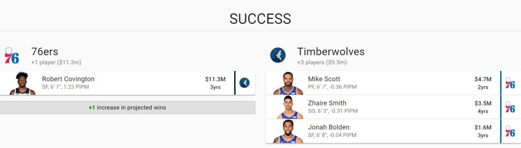 RoCo! Many hated to see RoCo go in the Jimmy Butler trade in November 2018. This trade would bring him back on a cheap deal and allow the Sixers to add another “3 and D” wing. He helps with spacing but doesn’t help in shot creation. Many contenders will be in the running for Cov’s services and it will likely take more than the package you see here to trade for him.