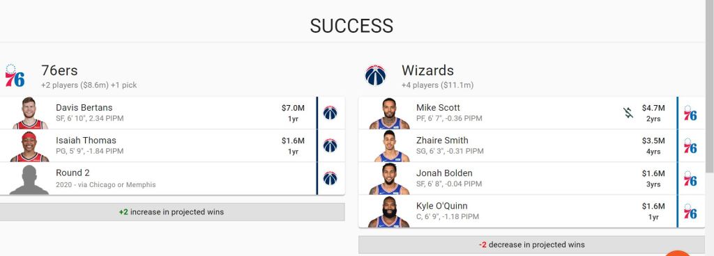 Sixers have been linked to Davis Bertans a lot recently and if the Sixers can get him, expect the Wizards to up the price. Some combination of this trade with or without Isaiah Thomas would work. Bertans would be the lights out shooter the Sixers need and could run the same action they ran with JJ Redick and Joel Embiid. Thomas would give the Sixers a back up point guard with experience that can get some buckets. Thomas would be a defensive liability and would have to play with a good group of defenders to make up for his size.