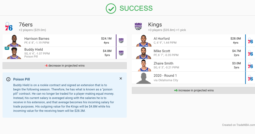 Next, I would make changes to the roster to help build around Ben Simmons and Joel Embiid. To maximize their talents, the best bet would be to put shooting and shot creation around them. First up would be trading Al Horford to try to get his contract off the books and creating more spacing for the Big Fella. I think the league knows that Al Horford still has value, but he was not put in the best position to succeed. I think due to this, we will have to give up an asset to trade Al Horford. The two teams I would contact about trading Horford would be the Oklahoma City Thunder and Sacramento Kings. Here are the potential trades: