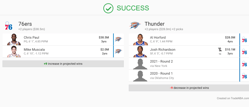 Both of these trades would get Horford’s contract off the books, but I think the most realistic scenario would be the Thunder trade. Getting a true ball handler and shot creator in CP3 would be amazing. Also, getting some much-needed shooting with Muscala would help shape this roster. Saying goodbye to Josh Richardson would hurt as he has shown flashes on offensive, but ultimately he would be missed on defense. You would hope that Matisse Thybulle can grow into that 3 & D contributor that the Sixers need. I’ve included this years’ first round draft pick in those trades, but don’t be surprised if Thybulle is included in either of the trades instead of the draft pick. It will absolutely cost the Sixers to get off the Horford contract. After the trade, the roster would potentially look like this: