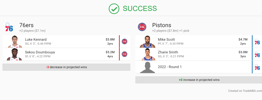 Getting Luke Kennard would bolster the Sixers shooting and would allow for Embiid and Kennard to do a lot of dribble hand off action. Zhaire Smith would get a new start in Detroit and Mike Scott and Sekou Doumbouya are salary filler. The Pistons would be hard pressed to do this deal, but adding a future first round pick from 2022 would sway the Pistons. The Pistons are in full re-build mode and collecting first round picks would only help their cause. After that trade, the roster would potentially look like this: